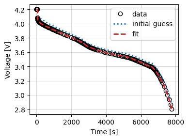 As well as passing the data, parameters, and known parameters, we can pass additional keyword arguments to customize the fit. Here we pass a dictionary objective_kwargs to specify the model to use. Here we use the SPMe model. If no model is specified, an error is raised. We remove the events from the model to avoid triggering the voltage cut-off event.